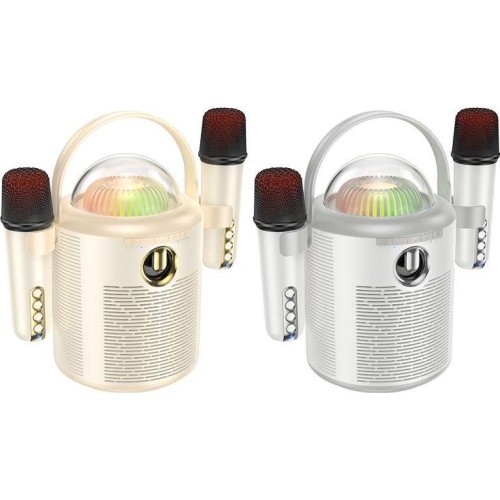 Колонка портативная, Bluetooth 5,1; чип: JL AC6965E4 Емкость аккумулятора: динамик 1800 мАч, микрофон 500 мАч; Время зарядки: 3 часа для динамиков, 2 часа для микрофонов. Время использования: 5 часов для динамиков, 16 часов для микрофонов. Мощность: 10 Вт , TF-карта, AUX и другие режимы с: двойным беспроводным микрофоном, поддержкой отмены исходного звука одной кнопкой, поддержкой ослепительного освещения музыки, размер: 190*120*215 мм.