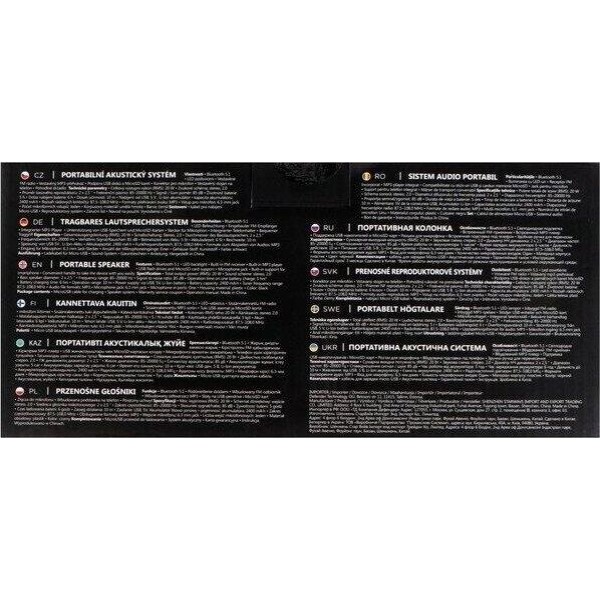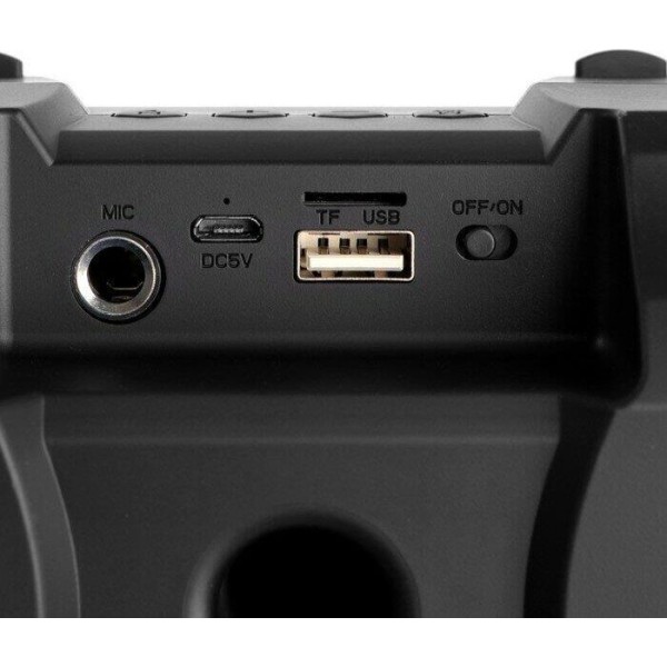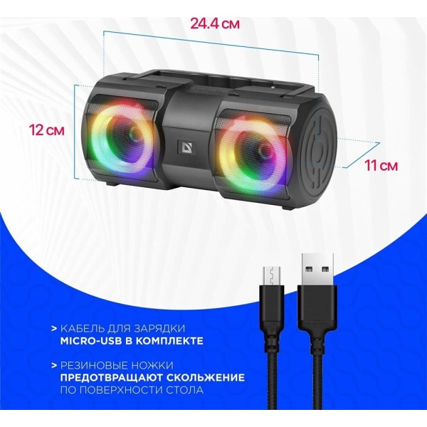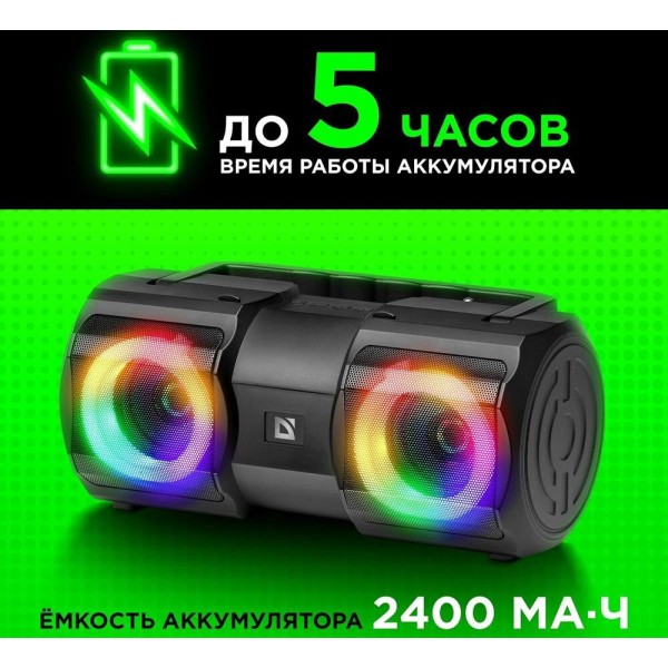 Тип акустической системы: активная Серия: для дома Суммарная выходная мощность (RMS): 20 Вт Соотношение сигнал/шум: 85 дБ Диапазон частот: 85–20000 Гц Звуковая схема: стерео, 2.0 Акустическое оформление: фазоинверторного типа Количество полос: 1 Широкополосный динамик: 2 х 2.5 " Сопротивление динамиков: 4 Ом Материал диффузора динамиков: целлюлоза Расположение порта фазоинвертора: тыл Аудиовходы: AUX-аудиовход Интерфейс беспроводной связи: Bluetooth 5.1 Дальность действия: 10 м True Wireless Stereo (TWS): нет Функция Hands free: нет Дисплей: нет Пульт ДУ: нет Совместимые ОС: без ограничений Подсветка: светодиодная Количество цветов подсветки: 6 Световые эффекты: есть Количество световых режимов: 4 Функция выключения подсветки: есть Тип разъема питания: Micro-USB Питание: от USB, 5 В , Li-Ion аккумулятор Емкость аккумулятора: 2400 мА·ч Напряжение аккумулятора: 3.7 В Тип элементов питания: форм-фактор 18650, 3.7В, 1200мАч - 2 шт (параллельное соединение)