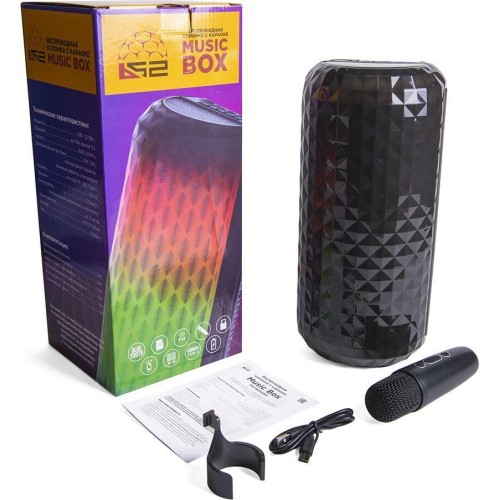 Представляем Вам потрясающую беспроводную колонку с караоке B52 Music Box. Наша новинка придется по вкусу тем, кто любит весело проводить время, устраивать выездные мероприятия и яркие вечеринки. Привлекательная деталь блютуз колонки с караоке – подсветка передней панели с разными режимами. Колонка поставляется с беспроводным микрофоном в комплекте. Также в комплекте есть держатель для него. Небольшой микрофон комфортно располагается в руке и позволяет свободно двигаться при исполнении любимых композиций. Размер колонки 127*127*281мм. К тому же, она достаточно легкая, можно брать ее с собой. Music Box не займет много пространства при транспортировке и всегда найдется место, где ее поставить. Внутри 2 динамика мощностью 5Вт каждый. Без зарядки колонка работает до 4 часов. Есть Bluetooth c радиусом действия соединения до 10 метров. На верхней панели расположены кнопки управления и разъемы: microSD/TF, USB, Type-C. Music Box оборудована удобной ручкой для переноски.