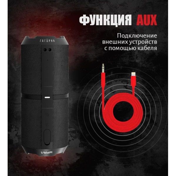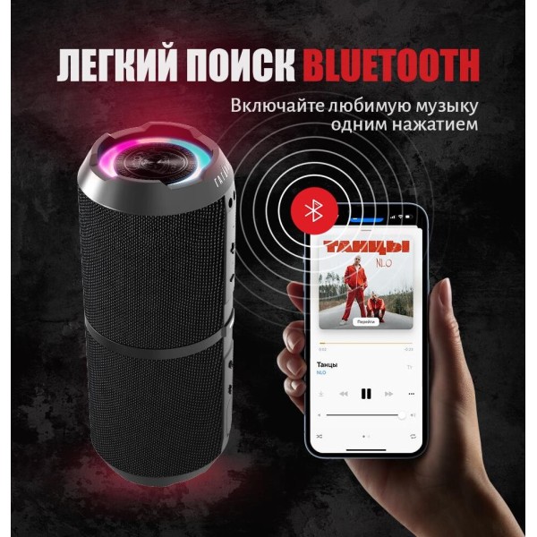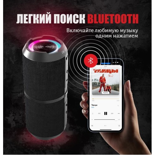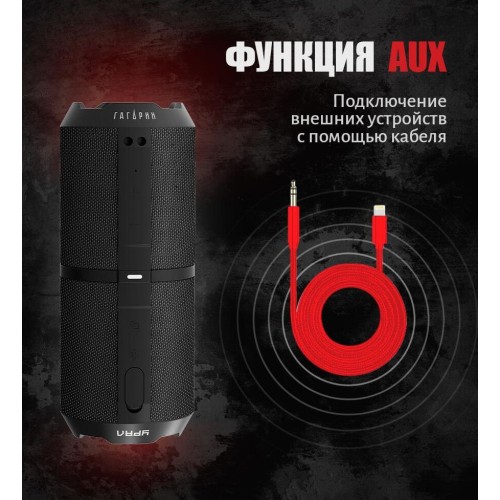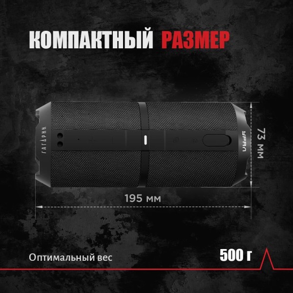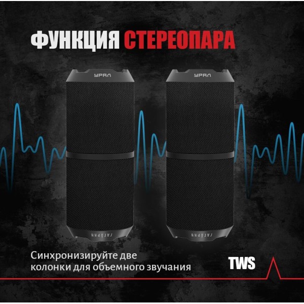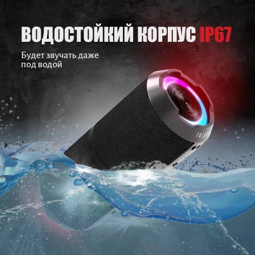 Степень защиты корпуса от пыли и влаги IP 67 Максимальная выходная мощность, Вт 2x10 Диапазон частот 70-20000 Отношение сигнал/шум, дБ, не менее 80 Bepcия Bluetooth 5.3 Профили Bluetooth.AVCR V 1.6, A2DP V1.3, HSP V1.2 Аудиокодек Bluetooth SBC Дальность действия Bluetooth, м, не менее 10 Расстояние между АС врежиме TWS, м, не более 5. Напряжение встроенного аккумулятора, В.7,4. Ёмкость встроенного аккумулятора, мАч. 2500 Типовое время работы без подзарядки в режиме воспроизведения при уровне громкости 50%, ч. 7 Время заряда встроенного аккумулятора, ч. 3-4. Разъем для подключения внешнего источника питания USB Type-C. Напряжение внешнего источника питания, В. 5 Размеры мм. 195х73х73 Вес гр. 500