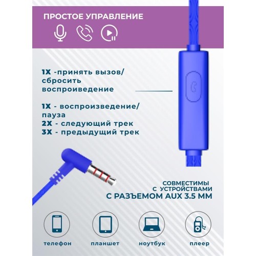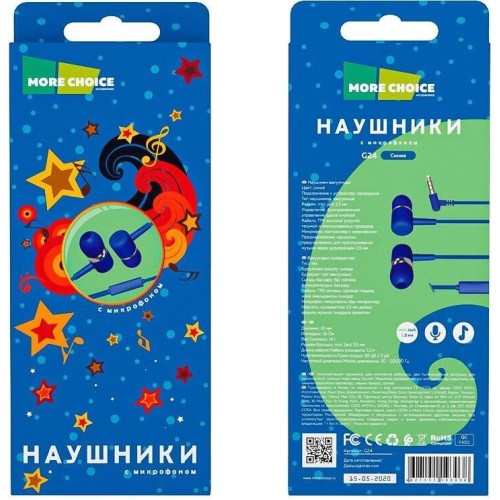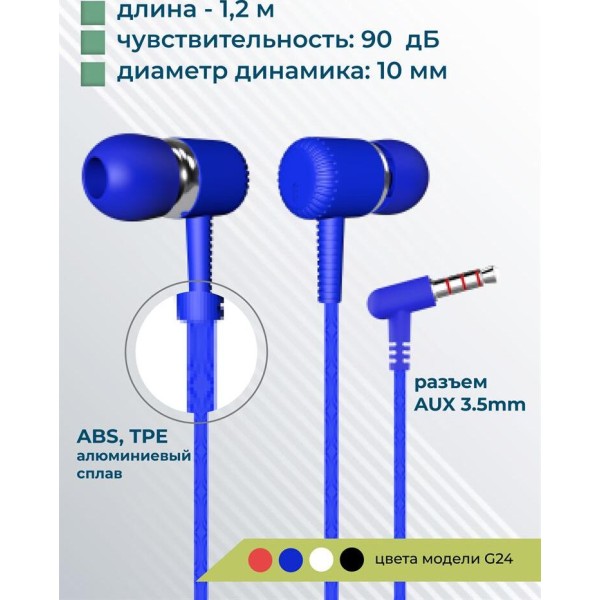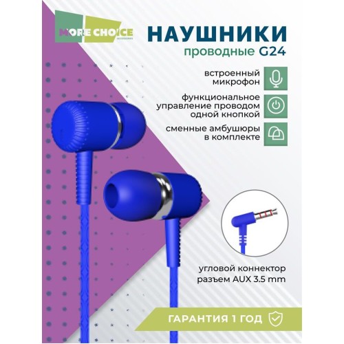 MORE CHOICE G24 Наушники вакуумные AUX разъём с микрофоном без рег.громкости длина 1.1м Тип: вакуумные Подключение: 3,5 мм Пульт ДУ: микрофон, старт/пауза, ответ на звонок Импеданс: 16 Ом Диапазон частот: 20 20000 Гц Чувствительность: 95 дБ 3 дБ Диаметр динамика: 10 мм Кабель наушников: ABS, TPE, длина - 1,2м