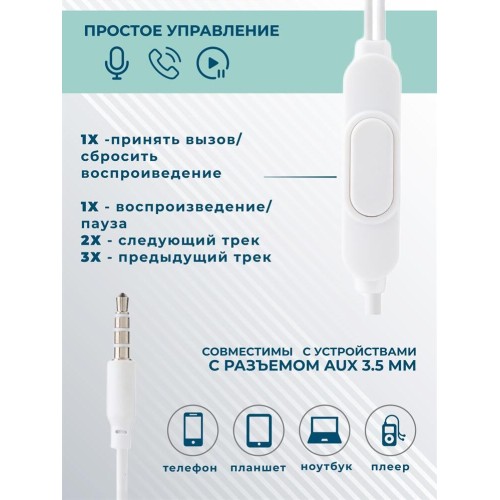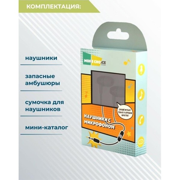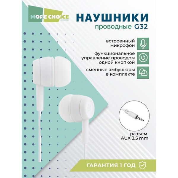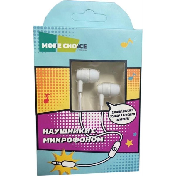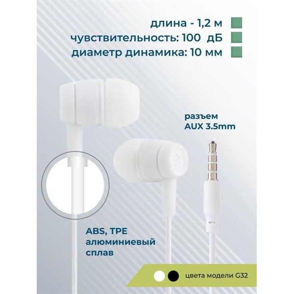 MORE CHOICE G32 Сила звука Наушники вакуумные AUX разъём с микрофоном без рег.громкости длина 1.2м Тип: вакуумные Подключение: 3,5 мм Пульт ДУ: микрофон, старт/пауза, ответ на звонок Импеданс: 16 Ом Диапазон частот: 20 – 20000 Гц Чувствительность: 100 дБ Диаметр динамика: 10 мм Кабель наушников: ABS, TPE и алюминиевый сплав, длина - 1,2м Комплектация: Наушники, чехол, запасные амбушюры, мини-каталог Размер упаковки: 158*90*23 Цвета: Black, White