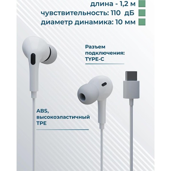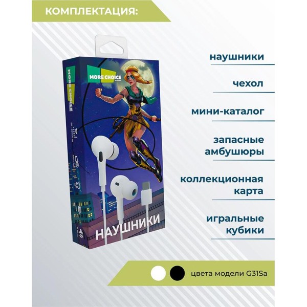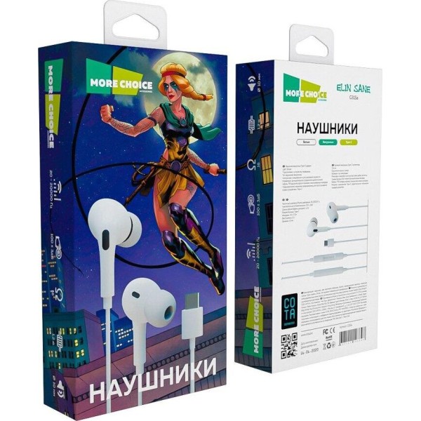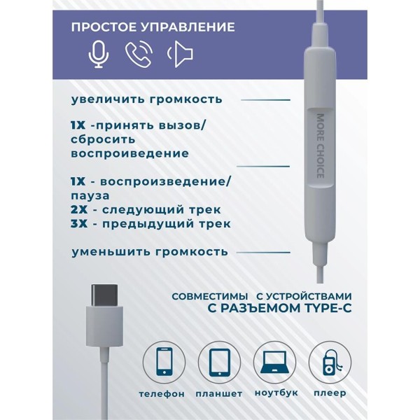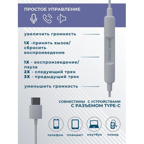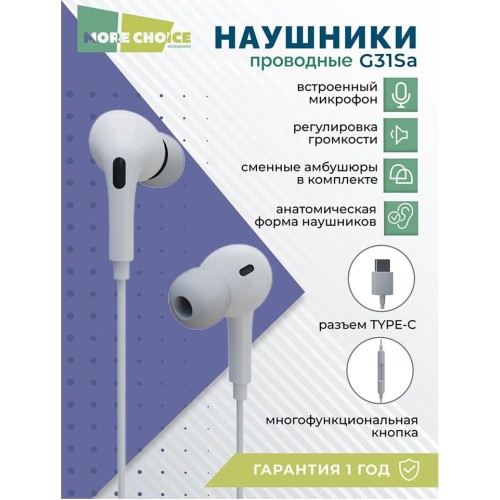 MORE CHOICE G31Sa Наушники вакуумные Type-C разъём с микрофоном и рег.громкости длина 1.2м Динамик: 10 мм Частотный диапазон: 20-20000 Гц Чувствительность: 100 3дБ Микрофон: контроллер с микрофоном и регулировкой громкости Функциональное управление одной кнопкой Длина кабеля: 1,2 м
