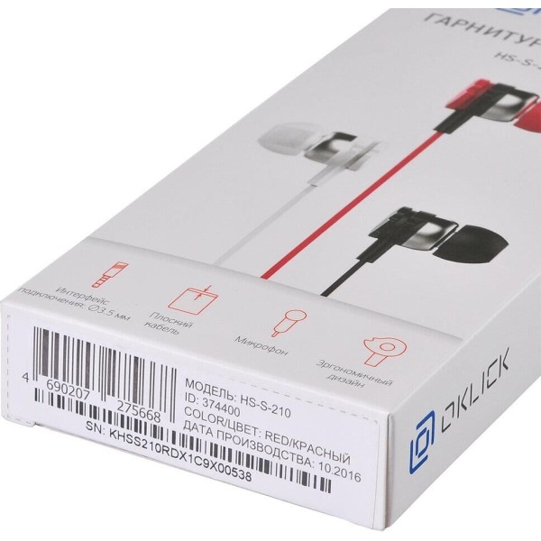 OKLICK Наушники HS-S-210, 3.5 мм, внутриканальные, красный d1r