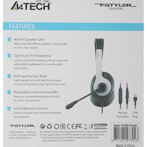 A4TECH Гарнитура Fstyler FH100U, для компьютера, накладные, проводные, белый / черный [fh100u (panda)]