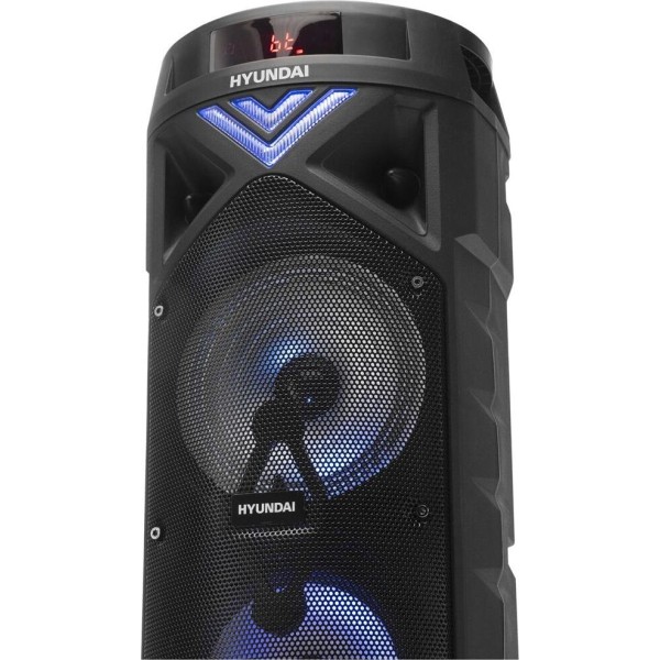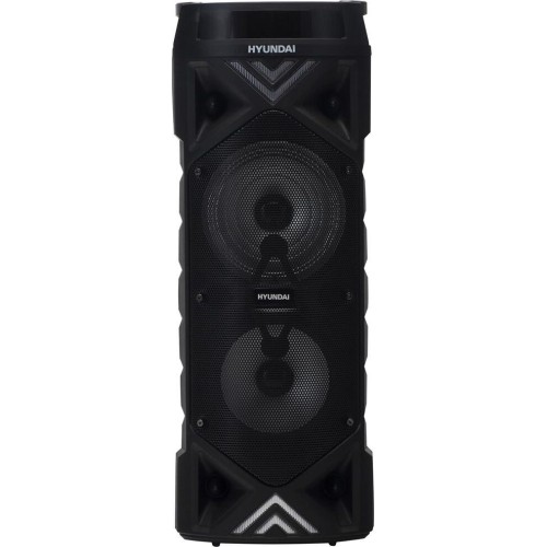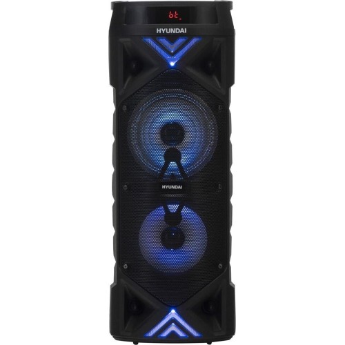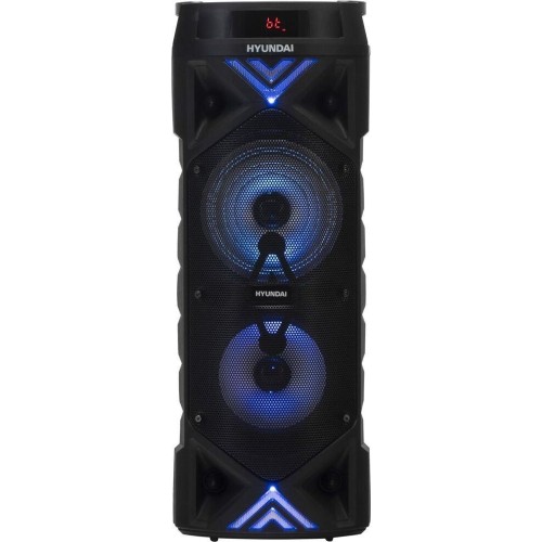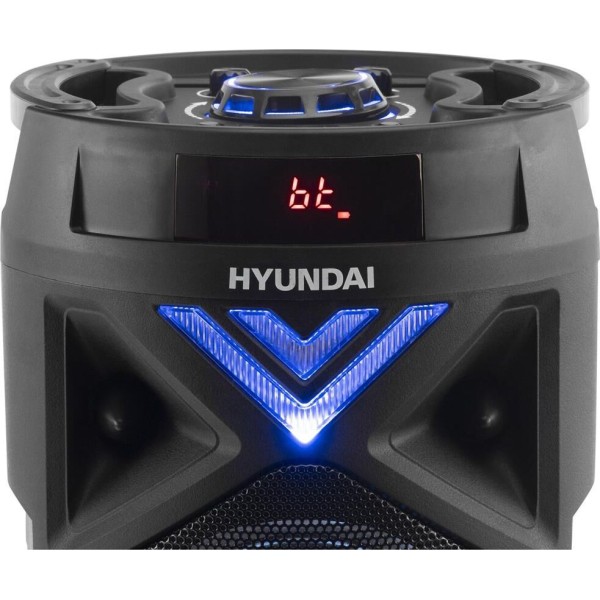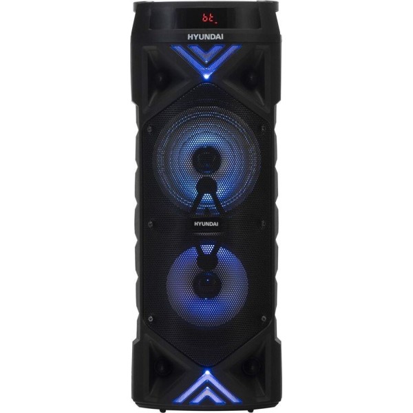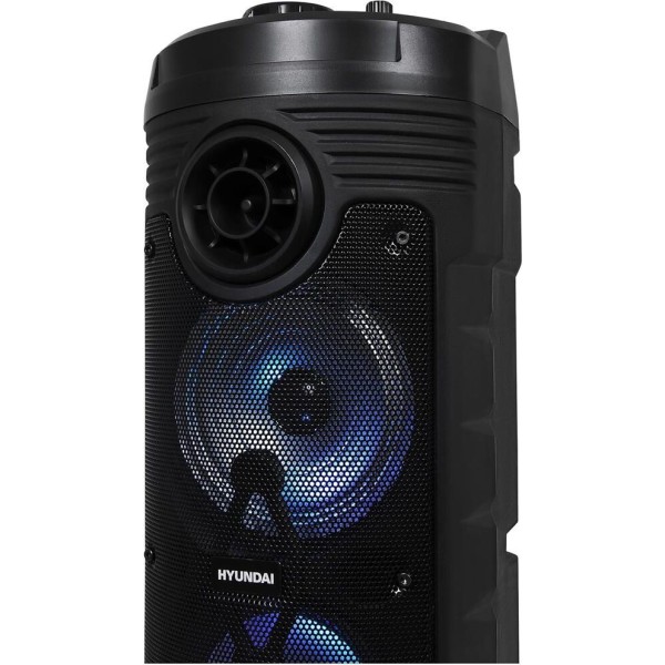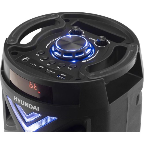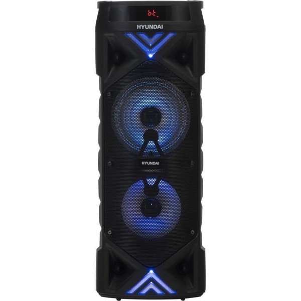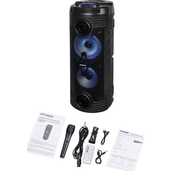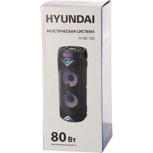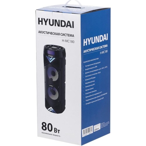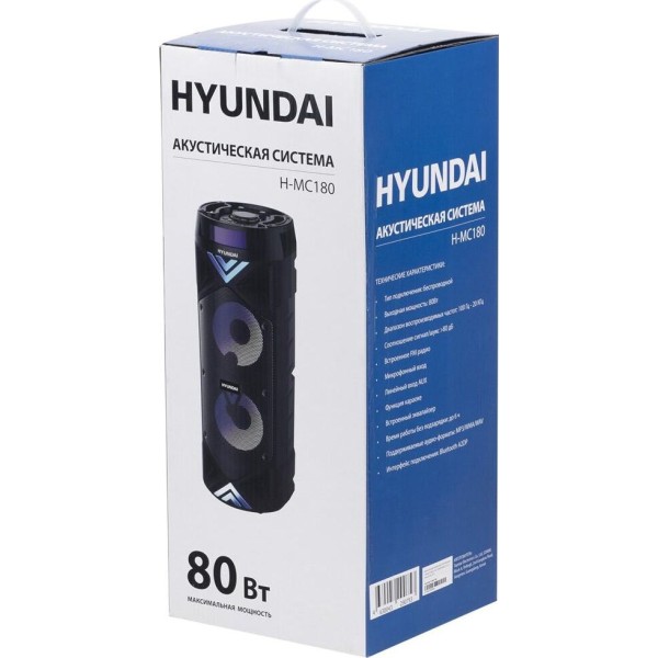 Портативная акустика HYUNDAI H-MC180 привлечет внимание каждого. Мощный звук, стильный дизайн и яркая RGB-подсветка зададут ритм вечеринке, поднимут настрой для активной тренировки и не дадут заскучать при вылазках на природу. Музыкальный центр умеет: воспроизводить музыку с внешних устройств и карт памяти; работать в качестве караоке; ловить радиоволны; регулировать частоты треков; выводить звук в наушники. Воспроизведение музыки За звучание отвечают два динамика и сабвуфер. Они воспроизводят музыку в диапазоне от 100 Гц до 20 кГц. Вы редко будете включать звук на максимум: 80 Вт мощности с лихвой хватает на большое помещение или для площадки на улице. Источником музыки могут быть карты памяти формата microSD, USB-накопители и внешние устройства. Старая техника подключается к акустике при помощи AUX-входа. Для беспроводного соединения с гаджетами встроен модуль Bluetooth. Когда домочадцы спят, используйте наушники. Правда, докупить их придется самостоятельно: гарнитура в комплекте не идет. Караоке Акустика H
