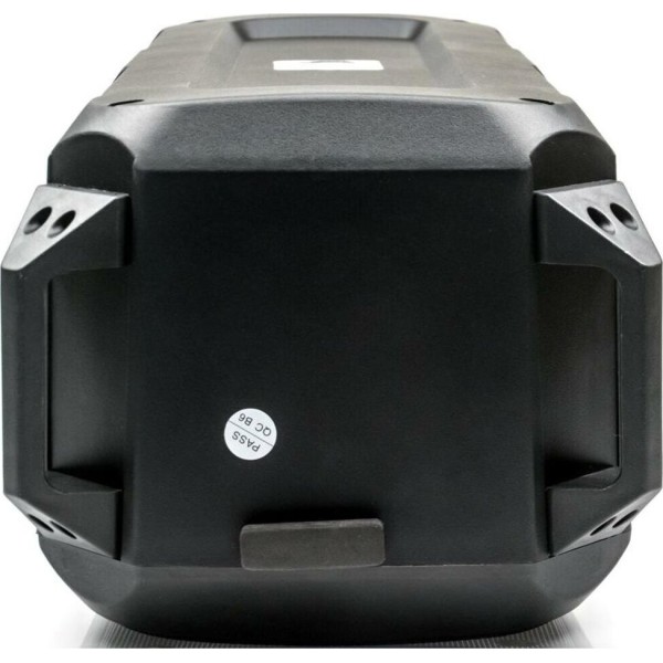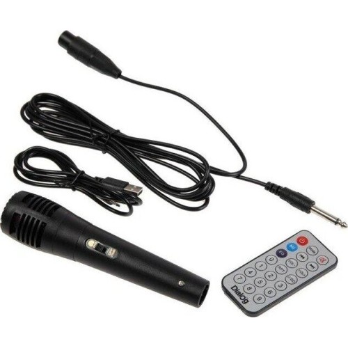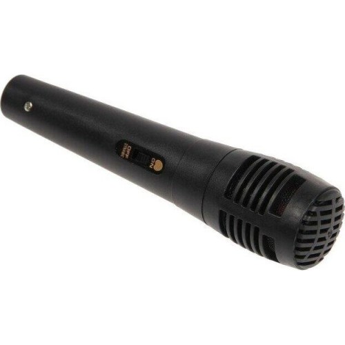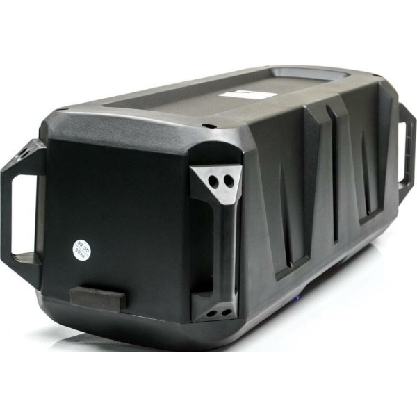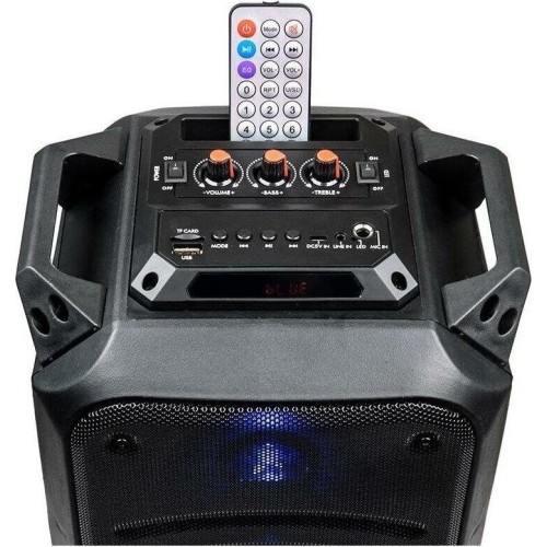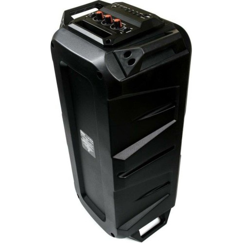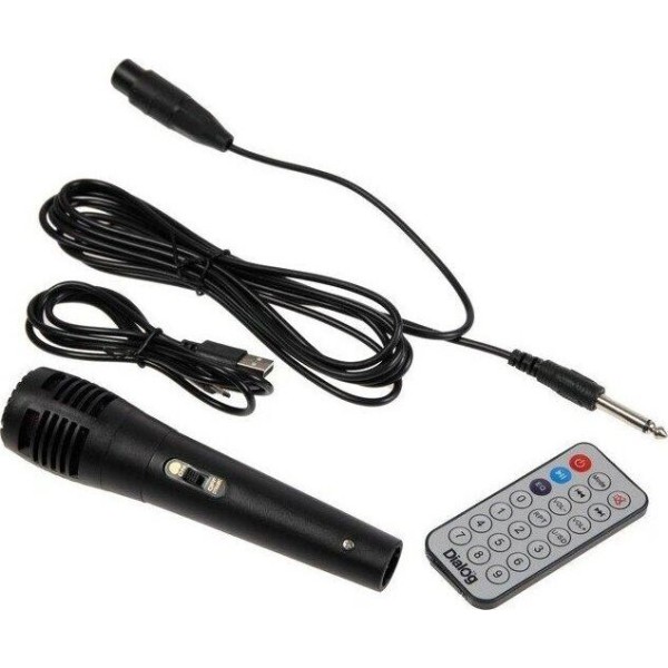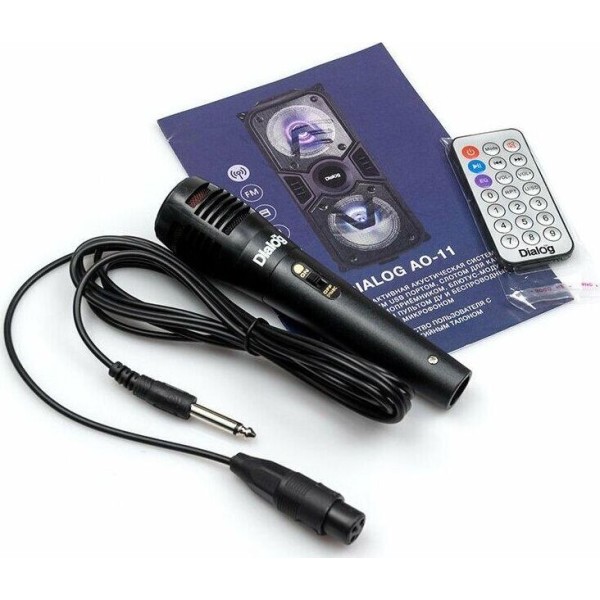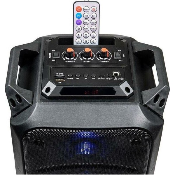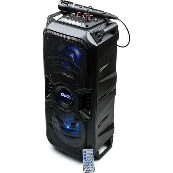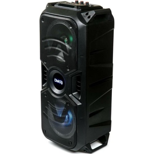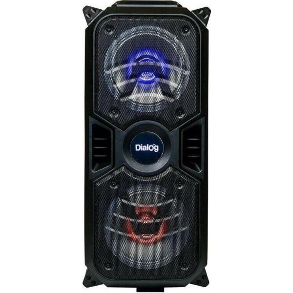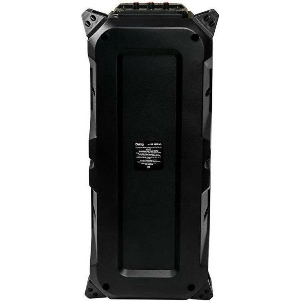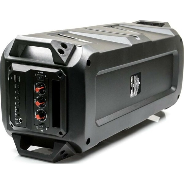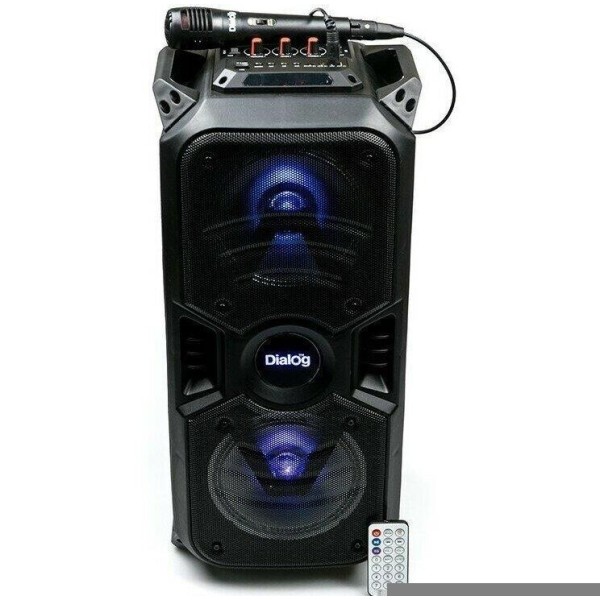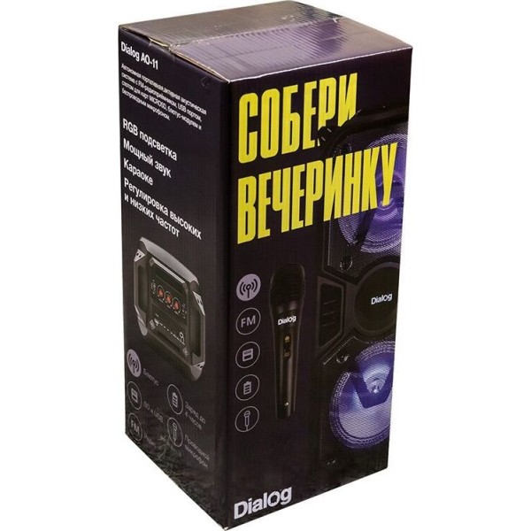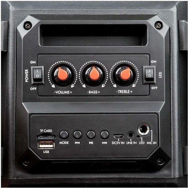 Портативная акустическая система c караоке, Bluetooth, microSD, USB и FM радио. Один микрофонный вход jack (6,35 мм, 1/4"), проводной микрофон в комплекте. Мощность системы RMS (Вт): 26. Сопротивление (Ом): 3. Частотный диапазон (Гц-КГц): 30-18. Гармонические искажения: <5%. Аккумулятор: встроенный Li-Ion аккумулятор 3600 мА*ч. Усилитель: встроенный. Динамик(и): НЧ 2*6,5" + ВЧ 1". Входы: Line in (миниджек 3.5 мм). Цветомузыка: Да, RGB цветомузыка на обоих динамиках. Полоса вверху, полоса внизу + динамическая подсветка обоих динамиков. Корпус: пластик. Размер корпуса (В*Ш*Г): 515*230*200 мм. Вес: 3,35 кг.