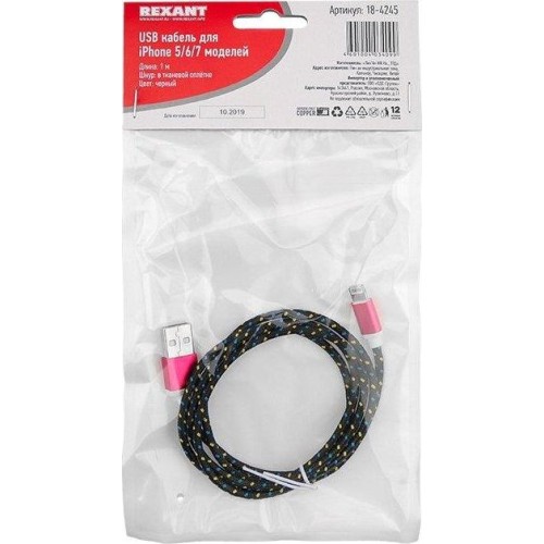 Дата-кабель REXANT (18-4245) USB-Lightning кабель /nylon/black-blue-yellow/1m/REXANT