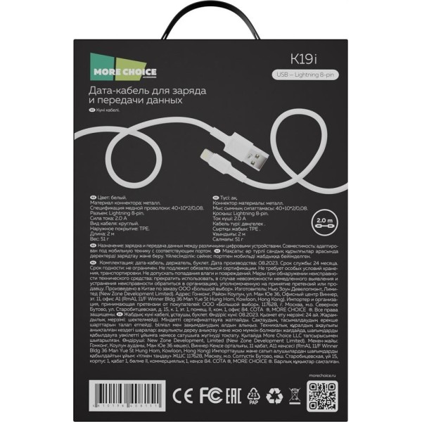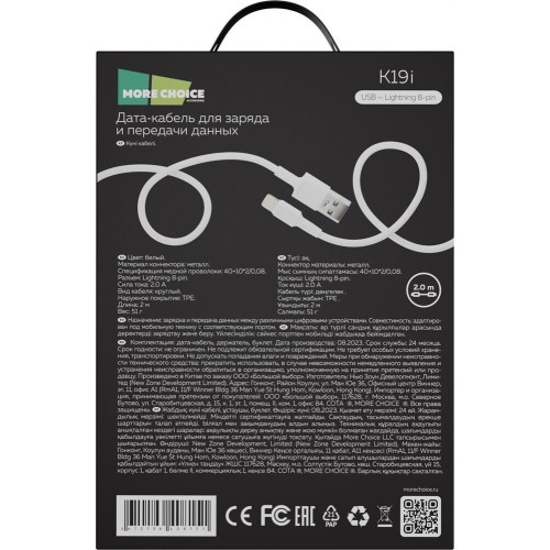 Кабель MORE CHOICE (4610196408151) K19i USB 2.0A для Lightning 8-pin - 2м White