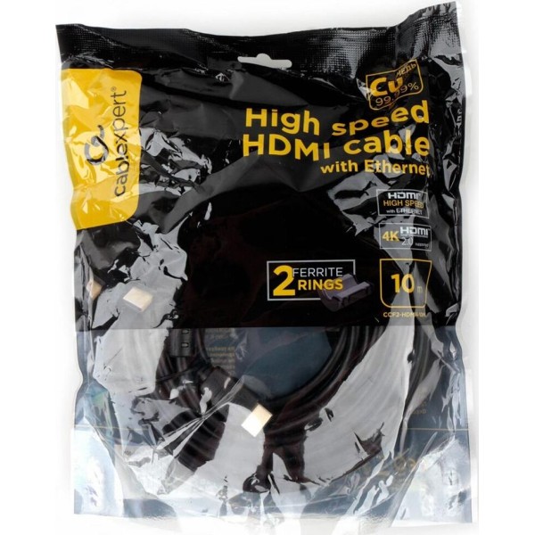 [кабели] Cablexpert Кабель HDMI CCF2-HDMI4-10M, 10м, v2.0, 19M/19M, черный, позол. разъемы, экран, 2 ферр кольца, пакет Дополнительно Поддерживаемые функции: CEC, HEC, HARC, 3D, Deep Color до 16 бит на канал, x.v.Color, Аудио высокой чёткости, включая SA-CD, DVD-Audio, DTS-HD Master Audio и Dolby TrueHD Cablexpert Кабель HDMI CCF2-HDMI4-10M, 10м, v2.0, 19M/19M, черный, позол. разъемы, экран, 2 ферр кольца, пакет масса(кг)