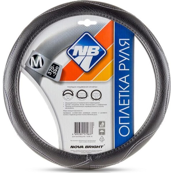 Оплетка на руль NOVA BRIGHT (М) экокожа, "черная шагрень" с белой волнистой прострочкой 47370