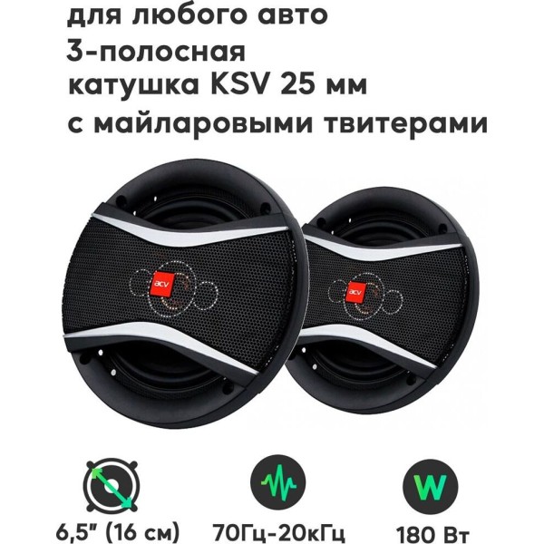 Звуковая катушка: KSV 25мм Диффузор: Чёрный полипропиленовый диффузор (литьё под давлением) с прорезиненным подвесом Магнит: 6 унций Диапазон частот: 70 - 20000Гц Воспроизведение звука Пиковая мощность: 180 Вт Номинальная мощность: 60 Вт Чувствительность: 88 дБ/Вт/м Импеданс: 4 Ом Общие характеристики Количество полос: 3-полосная Размер акустики: 6,5" (16 см) Корзина: Стальная Диапазон рабочих температур: -35 +55 °С