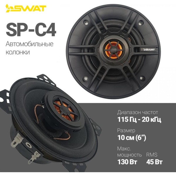 SWAT SP-C4 / 10 см., коакс., акустика 45/130 Вт./ Размер 4" (10 см) ; Количество полос 2 ; Мощность RMS 45 Вт ; Мощность PMPO 130 Вт ; Звуковая катушка 0,75" (1,9 см) ; Сопротивление 4 Ом ; Частотный диапазон 115 Гц - 20 кГц ; Чувствительность (1Вт/1м) 88 дБ ; Купол твитера 0,5" (1,27 см) Майлар ; Корзина Сталь ; Монтажный диаметр 93 мм ; Монтажная глубина 44 мм ; Защитная сетка В комплекте