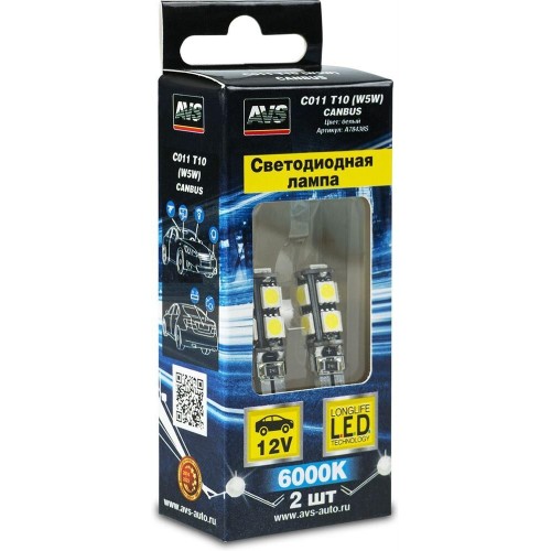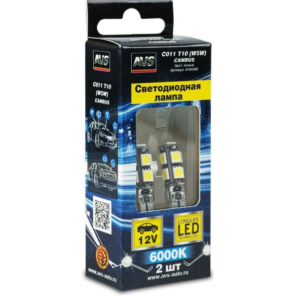 AVS C011 T10 /белый/ (W2.1x9.5d) CANBUS 9SMD 5050, блистер 2 шт