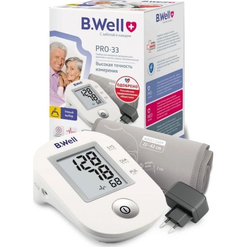 B.WELL PRO-33 AD Автоматический тонометр PRO-33 позволит регулярно осуществлять контроль уровня артериального давления, поможет в профилактике гипертонии и займет достойное место в каждой домашней аптечке. Тонометр PRO-33 имеет классический алгоритм измерения при выпуске воздуха из манжеты Intellect Classic. Индикатор аритмии выявит аритмию при нарушении сердечного ритма во время измерения. В комплектацию PRO-33 входит конусная манжета по форме руки, что гарантирует комфортное и точное измерение. Плотное прилегание манжеты к руке помогает достичь более точного результата во время измерения. • Intellect Classic – классический алгоритм измерения при выпуске воздуха из манжеты. Комфортное измерение, точный результат. • Индикатор аритмии – раннее выявление нарушений сердечного ритма. • Универсальная конусная манжета размера М-L для обхвата руки 22-42 см. • Простое управление одной кнопкой. • Память на последнее измерение. • Адаптер в комплекте.