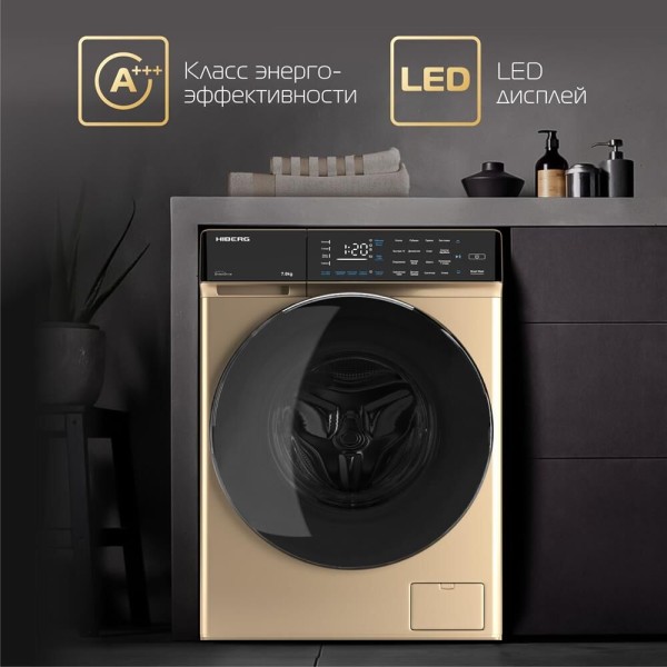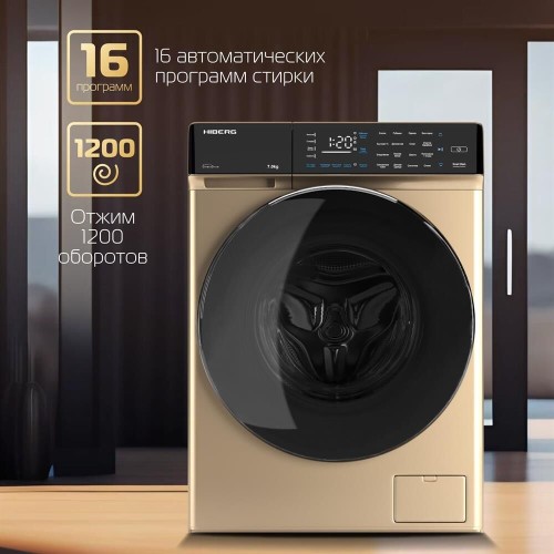 (ШхГхВ) 59,5х48х85см,Мотор Direct Drive Inverter Motor А+++, 16 программ, Максимальная загрузка белья – 7 кг, Скорость отжима max 1200 об, Защита от протечек -полная (AQUA STOP) Объем бака – 41 л, Диаметр двери – 52 см, Материал барабана – нерж. Сталь, Материал Корпуса – Полипропилен, Система управления дисбалансом, Система обнаружения ошибок, Блокировка от детей Напряжение, частота 220-240В/50Гц Цвет - Золотистый