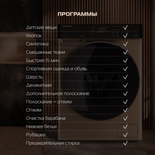 Smart Wash, экономичная программа, стирка шерсти, стирка хлопка, стирка спортивной одежды, стирка смешанных тканей, стирка синтетики, стирка детских вещей, стирка деликатных тканей, ручная стирка, полоскание, отжим, ежедневная стирка, дополнительное полоскание, быстрая стирка