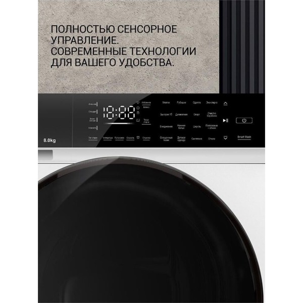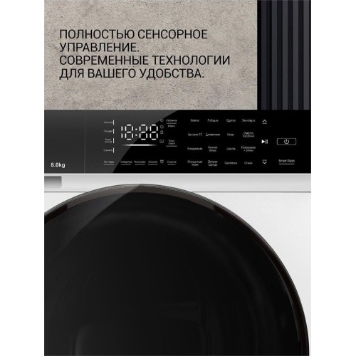 (ШхГхВ) 59,5х60х85см.Мотор Direct Drive Inverter Motor А+++, 16 программ, Максимальная загрузка белья – 8 кг Скорость отжима max 1200 об, Защита от протечек -полная (AQUA STOP) Объем бака – 58 л, Диаметр двери – 52 см, , Материал барабана – нерж. Сталь, Материал Корпуса – Полипропилен, Система управления дисбалансом, Система обнаружения ошибок, Блокировка от детей Напряжение, частота 220-240В/50Гц Цвет - Белый