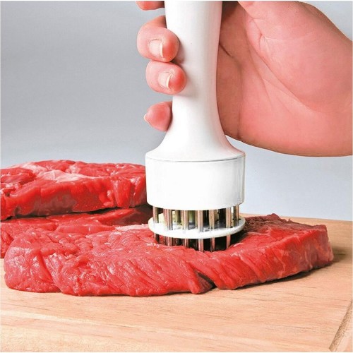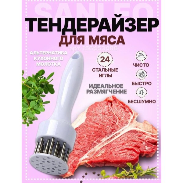 Ручной размягчитель мяса Размер: 19*5 см Ручной размягчитель мяса (тендерайзер или стейкер) - мясо тает во рту! Отлично подходит для подготовки сочных стейков и размягчения всех видов красного мяса. Положите размягчитель мяса на кусок сырого мяса, нажмите на ручку, а затем повторите процесс на всей поверхности стейка. Материалы - пластик, нерж сталь Упаковка: картонная коробка с подвесом Трансп - 24 шт!!!!!!