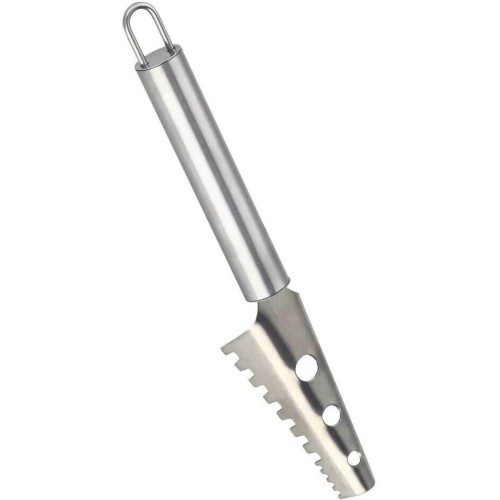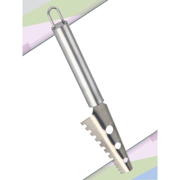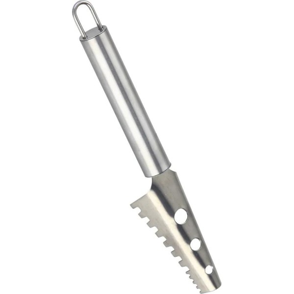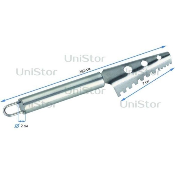 UniStor ULU Нож для чистки рыбной чешуи. Материал: нержавеющая сталь. Размер: 20,5х3,2см. Вес 65 г. Инновационное и уникальное приспособление для чистки рыбы. Скребок-лезвие расположен параллельно ручке. Для очистки чешуи достаточно потереть лезвием о тушку рыбы. Лезвие выполнено из нержавеющей стали, которая не окисляется и не ржавеет.