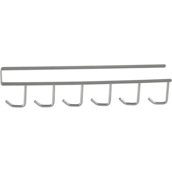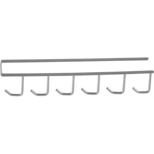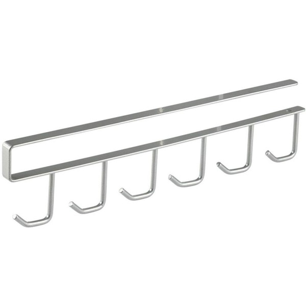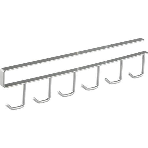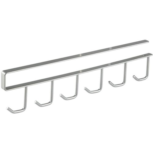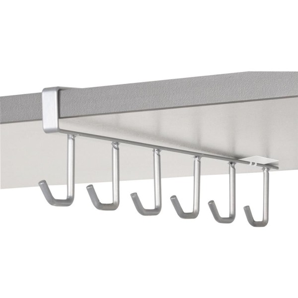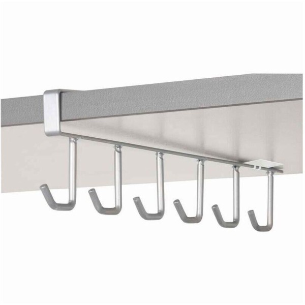 Держатель навесной полочный для чашек рассчитан на 6 шт Размер: 28*1*6,5 см Для полок толщиной не более 2,5 см Прозрачный самоклеящийся фиксатор в комплекте Материал: окраш.металл (порошковое покрытие, цвет: серебристый)