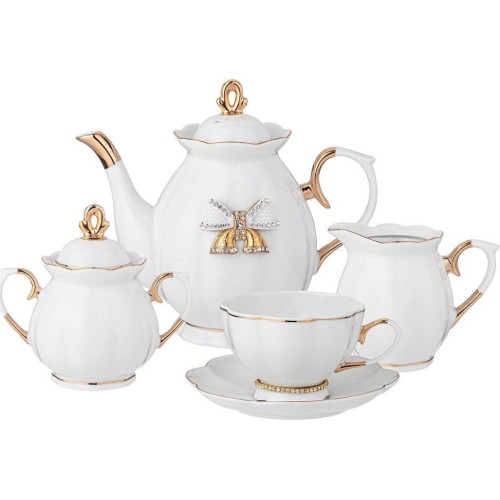 Чайный сервиз на 6 персон "Venezia" Lefard состоит из 15 предметов: чайник 950 мл, сахарница 400 мл, молочник 170 мл, чашка 240 мл — 6 шт, блюдце — 6 шт. Белоснежный белый фарфор, покрытый сверкающей глазурью и украшенный стразами swarovski, дополнит убранство вашего стола, впишется в интерьер любой кухни, гостиной, кафе или ресторана. Посуда надежно упакована в красивую коробку с логотипом бренда — набор станет отличным памятным подарком родным, друзьям или коллегам.