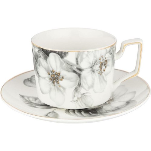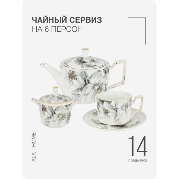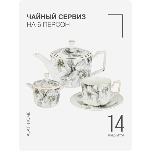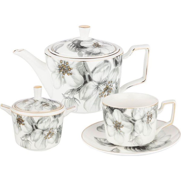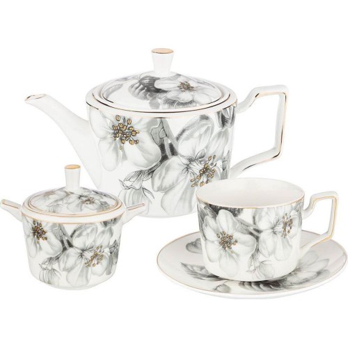 Описание Чайный набор выполнен из тонкостенного фарфора. Стильная форма, вместительный объем, модная черно-белая деколь, отделка золотом - все это делает коллекцию неотразимой и очень привлекательной. Это прекрасный подарок. Нельзя ставить в микроволновую печь, не рекомендуется мыть в посудомоечной машине. Комплектация: Чайник: 1 шт. Сахарница: 1 шт. Чашки: 6 шт. Блюдца: 6 шт. Характеристики: Материал: фарфор. Объем чайника: 950 мл. Объем сахарницы: 300 мл. Объем чашек: 280 мл. Количество персон: 6.