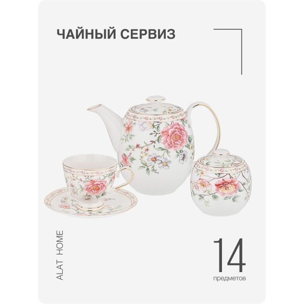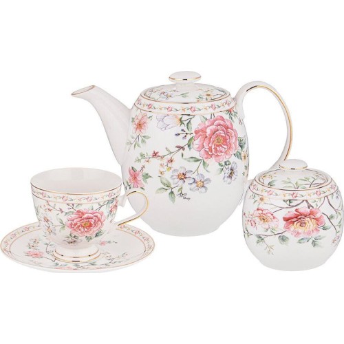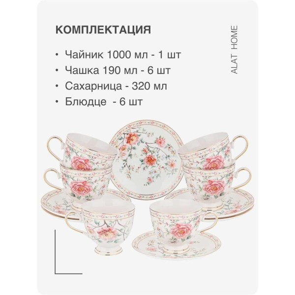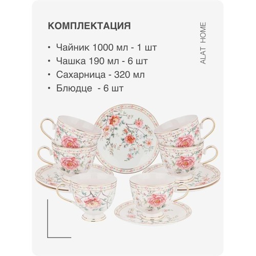 Комплектность: чайник 1100 мл -1 шт., сахарница 350 мл - 1 шт., чашка 220 мл - 6шт., блюдце - 6 шт.