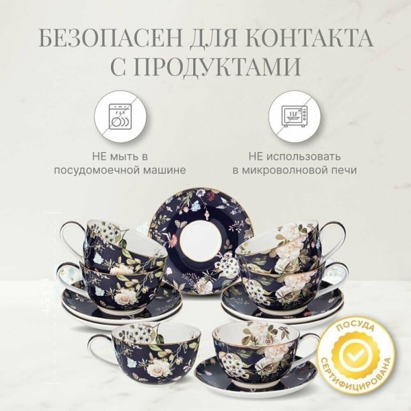 Эксклюзивные коллекции "Belle" и "Belle" кобальт достойны быть отличным подарком. Чайный набор включает шесть чашек и 6 блюдец самой оптимальной формы и объема. Предметы выполнены из магнезийного фарфора. Нежные цветы и теплые цвета деколи будут украшением любой кухни и помогут создать настоящий домашний уют. Не рекомендуется мыть в посудомоечной машине, запрещено использовать в микроволновой печи.