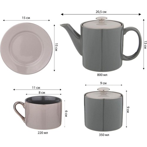 Комплекность: чайник 700 мл - 1 шт., сахарница 300 мл - 1 шт., чашка 180 мл - 6 шт., блюдце - 6 шт.