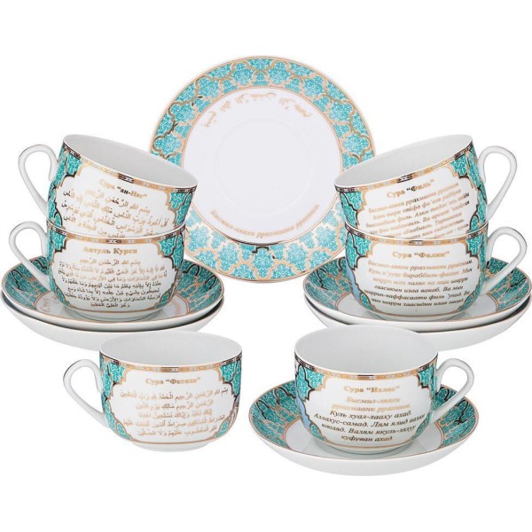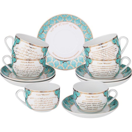 ТМ LEFARD представляет эксклюзивную коллекцию посуды «Суры из Корана». Кувшины, чайники, сахарницы, кружки, чайные пары, декоративные тарелки и другие предметы выполнены из высококачественного тонкостенного фарфора. Восточный орнамент, небольшие отрывки Сур из Корана на классическом арабском и русском языках с отделкой золотом украшают изделия. Это прекрасный мусульманский подарок, всегда нужный и теплый. Относитесь к нему бережно и с почтением. Посуду коллекции можно использовать как в повседневной жизни, так и на торжественном приеме. Не рекомендуется мыть в посудомоечной машине и использовать в микроволновой печи.