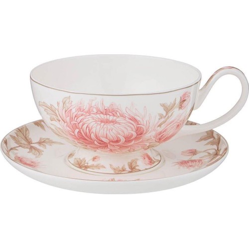 Фарфоровая чашка 400 мл с блюдцем, в коробке, с рисунком цветов