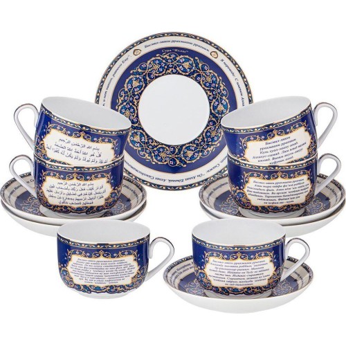 ТМ LEFARD представляет эксклюзивную коллекцию посуды «Суры из Корана». Кувшины, чайники, сахарницы, кружки, чайные пары, декоративные тарелки и другие предметы выполнены из высококачественного тонкостенного фарфора. Восточный орнамент, небольшие отрывки Сур из Корана на классическом арабском и русском языках с отделкой золотом украшают изделия. Это прекрасный мусульманский подарок, всегда нужный и теплый. Относитесь к нему бережно и с почтением. Посуду коллекции можно использовать как в повседневной жизни, так и на торжественном приеме. Не рекомендуется мыть в посудомоечной машине и использовать в микроволновой печи.