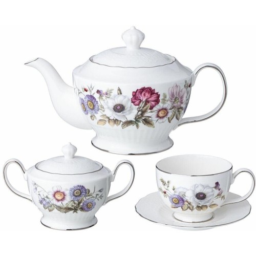 ТМ LEFARD коллекция "BOUQUET" с ботаническим рельефным рисунком, цветочным декором и изящной платиновой полосой. Так и хочется пробежаться по роскошному лугу, упасть в траву и замереть, слиться с этим миром и услышать стрёкот кузнечиков, гул шмелей, шелест лёгких крыльев стрекоз и бабочек. Упрочненный высококачественный тонкий фарфор. Современные эксклюзивные формы, украшенные рельефными линиями и уникальным декором, удобные размеры. Обеденные и закусочные тарелки, суповая тарелка - салатник, овальные блюда и салатники различного назначения - все это делает сервировку ежедневного и праздничного стола изящной и неповторимой. Декорированный рельефный фарфор прекрасно сочетается с белой рельефной частью коллекции. Это прекрасный подарок. Посуда прошла сертификацию. Безопасна для контакта с пищевыми продуктами. Мыть с применением мягких моющих средств. Нельзя использовать в микроволновой печи, не рекомендуется мыть в посудомоечной машине. Комплектность: чайник, сахарница, 6 чашек 280 мл, 6 блюдец.