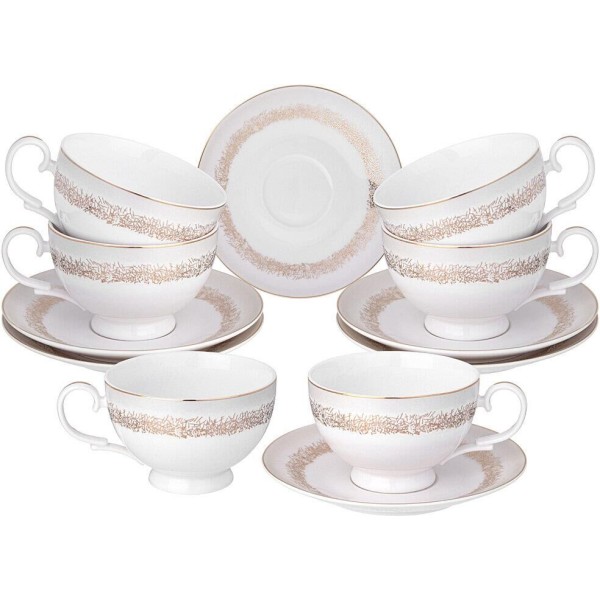ТМ LEFARD Чайный набор "Золотой песок" для торжественых застолий и семейных обедов. Изысканный фарфор Bone Pocelain с эффектом костяного фафора, тонкий и полупрозрачный, прочный и никогда не темнеет. Утонченный кружевной рельефный орнамент выглядит объемным и привлекательным благодаря различной обработке выпуклых и базовых поверхностей. Изящная золотая обводка придает блеск и торжественность. Эта посуда замечательный подарок на свадьбу, юбилей, день рождения, который наверняка пригодится каждой семье, запомнится навсегда и прослужит долгие годы. Дизайнеры торговой марки предлагают чайный и обеденный сервизы и наборы тарелок и чайных пар, чтобы сформировать полную сервировку стола предметами коллекции на 6 или 12 персон.