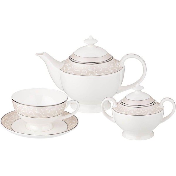 ТМ LEFARD коллекции столовой посуды из костяного фарфора. "5 o'clock" не оставит равнодушным и украсит любой праздничный стол. Ваш стол стильный, элегантный, с изящным орнаментом и тонкой золотой полосой по краю. 45 % костяной золы сделало изделия тонкими, прочными, прозрачными, мягкого молочного цвета. Изготовление изделий из костяного фарфора не поддаётся автоматизации, производство таких вещей возможно только с использованием ручного труда. Не рекомендуется использовать в микроволной печи, посудомоечной машине. Комплектность: чайник 1200 мл, сахарница 300 мл, чашка 250 мл 6 шт., блюдце 6 шт.