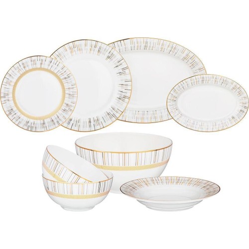 Комплектность: тарелка обеденная 25,5 см 6 шт., тарелка закусочная 20,5 см 6 шт., тарелка суповая 23 см 6 шт., салатник 23 см 1750 мл, салатник 16 см 750 мл 2 шт., блюдо овальное 36 см. блюдо овальное 23 см.