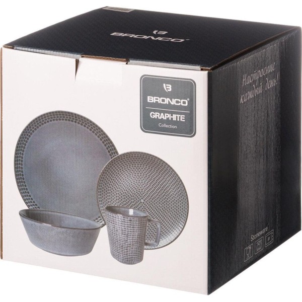Коллекция ТМ BRONCO Graphite глубокого серого цвета с великолепным графическим подглазурным рисунком и стильной удобной формы оптимальных размеров. Все изделия выполнены из высокотемпературной каменной керамики и обожжены при температуре от 1100 до 1400 градусов. При такои? температуре вода и воздух из глинянои? массы полностью испаряются и изделия становятся легче, плотнее, крепче, приближаясь по своим характеристикам к фарфору. Современные рестораторы выбирают каменную керамику именно из-за ее? прочности и стойкости к перепадам температур. Поверхность изделий покрыта глянцевой реактивной глазурью. Изделия не впитывают вкусы и запахи продуктов, хорошо сохраняют тепло и холод. Они легки в уходе, вызывают приятные тактильные ощущения, длительное время сохраняют первоначальный внешний вид. Каменную керамику можно мыть в посудомоечнои? машине, использовать в микроволновой печи. Комплектность: тарелка обеденная 25 см 4 шт., тарелка закусочная 20,5 см 4 шт., салатник 16,5*5,5 см 4 шт., кружка 400 мл 4 шт.