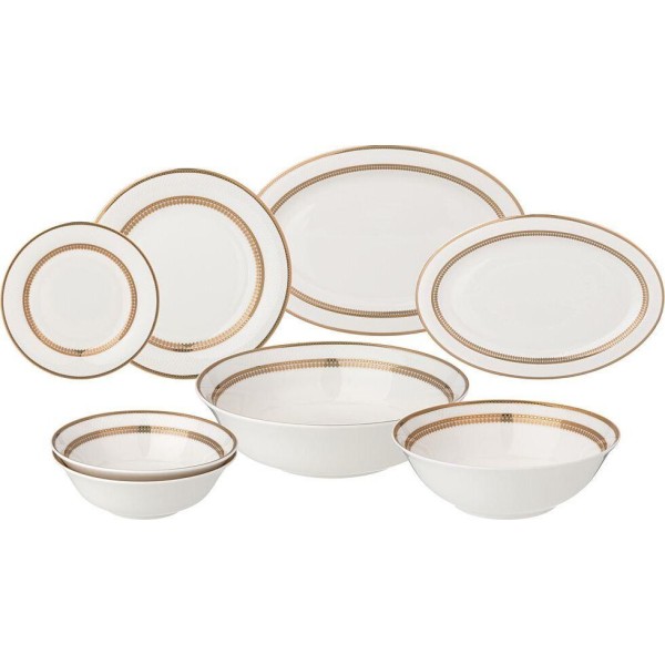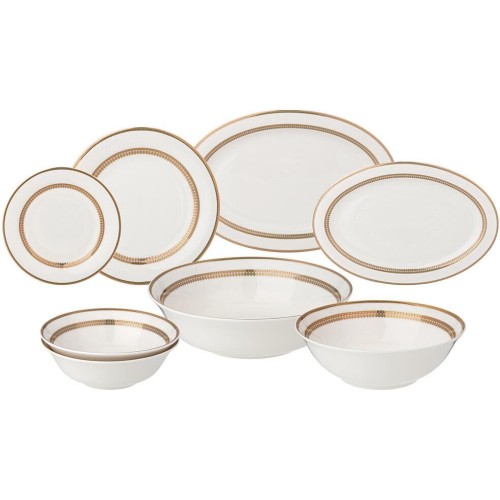 Комплектность: тарелка обеденная 27*2,3 см 6 шт., тарелка закусочная 20,5*2 см 6 шт, тарелка суповая - салатник 800 мл 18*6 см 6 шт., салатник 1500 мл 23*6,5 см, салатник порционный 450 мл 15*5 см 2 шт., блюдо овальное 36*24,5*2,6 см, блюдо овальное 31*21*2,3 см