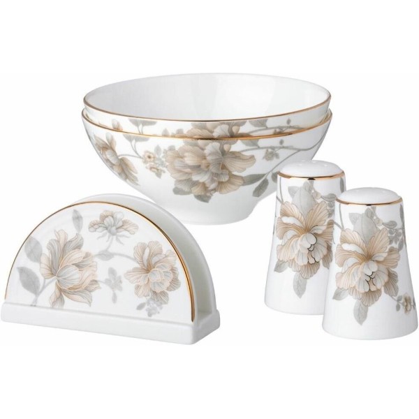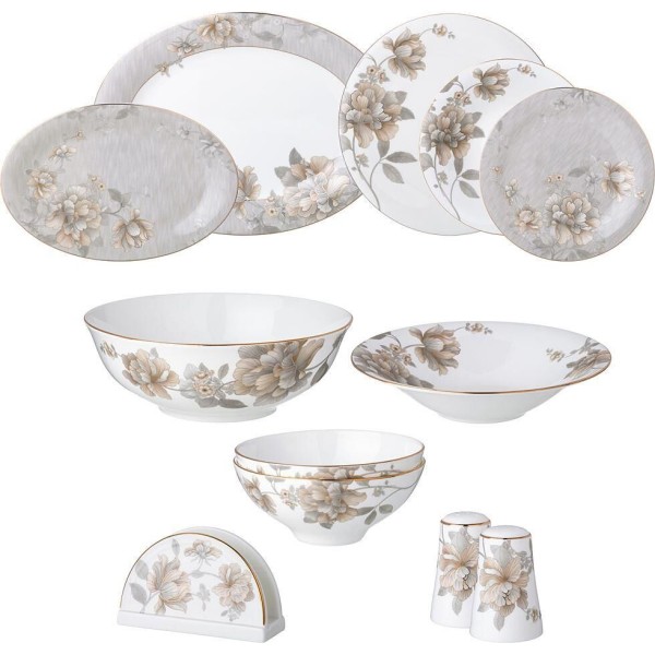 Комплектность: тарелка обеденная 27,5 см – 6 шт., тарелка закусочная 21 см – 6 шт., тарелка суповая 21,5 см – 6 шт., салатник сервировочный 23 см – 1 шт., салатник порционный 14 см – 2 шт., блюдо овальное 36*27 см – 1 шт., блюдо овальное 25,5*17 см – 1 шт., салфетница – 1 шт., набор для специй – 2 шт.