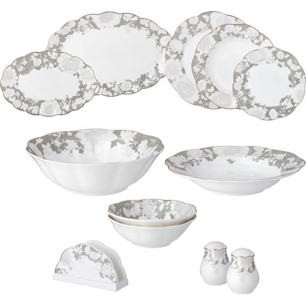 Комплектность: тарелка обеденная 27,5 см – 6 шт., тарелка закусочная 21 см – 6 шт., тарелка суповая 21,5 см – 6 шт., салатник сервировочный 23 см – 1 шт., салатник порционный 14 см – 2 шт., блюдо овальное 36*27 см – 1 шт., блюдо овальное 25,5*17 см – 1 шт., салфетница – 1 шт., набор для специй – 2 шт.