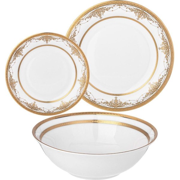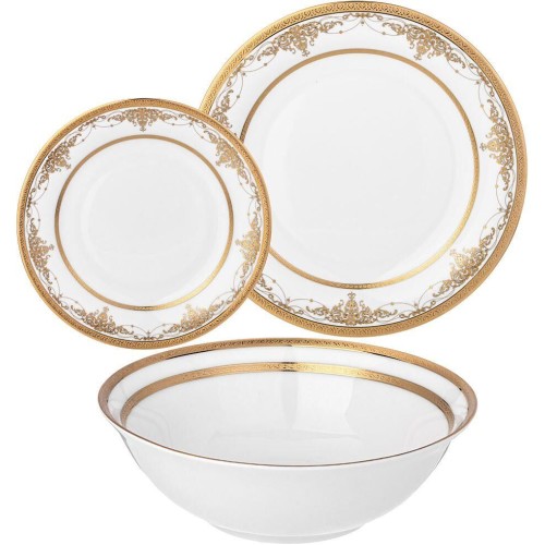 ТМ LEFARD Набор посуды столовой "Дворец" для торжественых застолий и семейных обедов. Изысканный фарфор Bone Pocelain с эффектом костяного фафора, тонкий и полупрозрачный, прочный и никогда не темнеет. Утонченный кружевной рельефный орнамент выглядит объемным и привлекательным благодаря различной обработке выпуклых и базовых поверхностей. Изящная золотая обводка придает блеск и торжественность. Эта посуда замечательный подарок к любому торжеству, она наверняка пригодится каждой семье, запомнится навсегда и прослужит долгие годы. Дизайнеры торговой марки предлагают чайный и обеденный сервизы и наборы чайных пар, чтобы сформировать полную сервировку стола предметами коллекции на 6 или 12 персон.