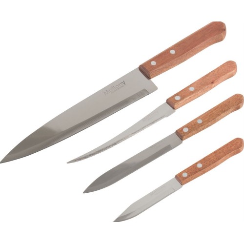 Набор ножей с деревянной рукояткой Состав набора: - нож поварской (длина лезвия 20 см, толщина стали 1,2 мм) - нож универсальный (длина лезвия 15 см, толщина стали 1,0 мм) - овощной (длина лезвия 12,5 см, толщина стали 1,0 мм) - овощной малый (длина лезвия 9 см, толщина стали 1,0 мм) Материал: нержавеющая сталь, дерево