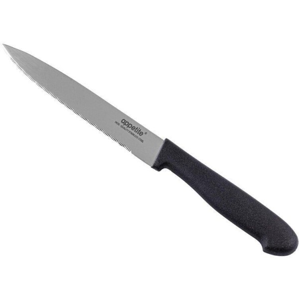 Нож кухонный Appetite Гурман изготовлен из нержавеющей стали с удобной пластиковой ручкой. Такой нож предназначен для нарезки овощей, фруктов, сыра, небольших буханок, хлеба, булочек, масла и других продуктов. Лезвия долгое время остаются острыми и не требуют частого затачивания. Этот прибор предназначен для резки продуктов с минимальным усилием, по этой причине его нужно использовать с осторожностью. Эргономическая рукоятка удобно ложится в руке, не скользит и обеспечивает комфортное использование прибора.