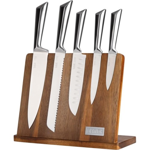 Набор ножей Tendency, 6 пр Материал - нержавеющая сталь, дерево Состав: нож поварской 20,0 см - 1 шт, нож для хлеба 20,0 см - 1 шт, нож сантоку 15 см - 1 шт, нож универсальный 12,5 см – 1 шт, нож для чистки 9 см – 1 шт, подставка магнитная из дерева акации - 1 шт Рекомендуется ручная мойка Упаковка - цветная коробка