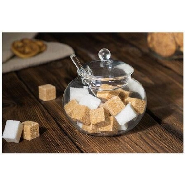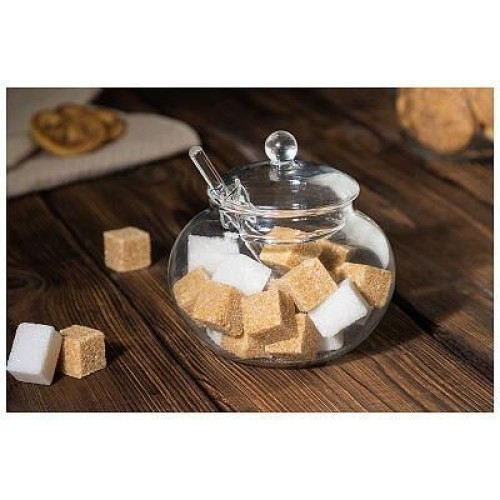 Сахарница стеклянная 350 мл, DOLCE, со стеклянной ложечкой Материал: боросиликатное стекло. Цветная коробка+пузырчатая пленка + доп пакет для ложечки. Температурный режим использования: до +150?. Коэффициэнт линейного расширения: 3.3*10-6/K Можно мыть в посудомоечной машине в отсеке для хрупкой посуды.