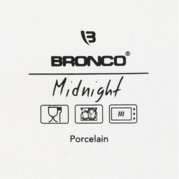 ТМ BRONCO коллекция MIDNIGHT - это запатентованный продукт. Черная поверхность, визуально близкая к чугуну, имеет металлическую текстуру, что придает фарфоровой посуде сдержанный и фундаментальный стиль. Посуда устойчива к царапинам. Нож и вилку можно использовать прямо на поверхности, не царапая глазурь. Черный сдержанный и устойчивый цвет, высокая прочность и долговечность делают эту коллекцию излюбленной покупателями во всем мире. Вся продукция сертифицирована, безопасна для контакта с пищевыми продуктами. Можно использовать в духовом шкафу и микроволновой печи, мыть в посудомоечной машине.
