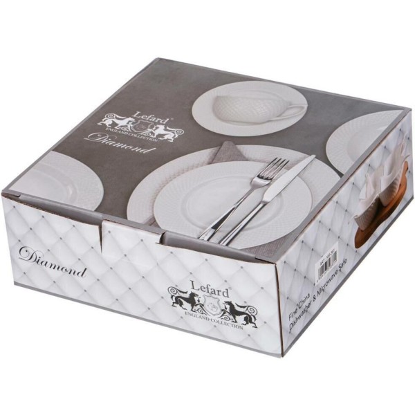 TM Lefard коллекция "Диаманд" - посуда и предметы сервировки из белого фарфора с рельефом. Изделия выполнены из упрочненного фарфора. Стильная упаковка. Идеальная сервировка праздничного и ежедневного стола. Отличный подарок! Продукция сертифицирована, безопасна для контакта с пищевыми продуктами. Можно ставить в микроволновую печь и мыть в посудомоечной машине. Примечание: деревянная часть НЕ предназначена для использования в микроволновой печи и мытья в посудомоечной машине !