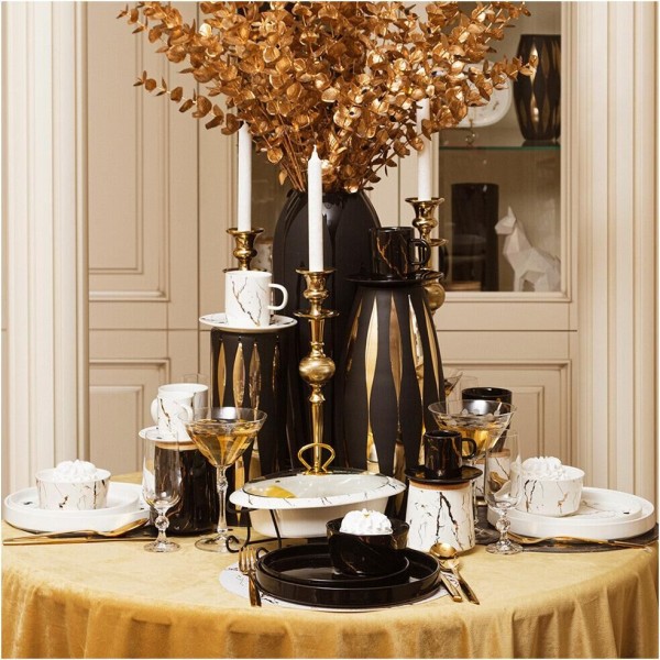 Коллекция "Fantasy" ТМ LEFARD - это модная сервировка стола и стильный кухонный интерьер в классическом черном с золотом цвете. Блюда и формы различных размеров, менажницы на бамбуковых подставках, банки, тарелки и салатники различного назначения, чайники, чайные пары и кружки выполнены из упрочненного фарфора. Четкие линии, сверкающее глянцевое покрытие. Вы и Ваш стол неотразим! Посуда прошла сертификацию. Безопасна для контакта с пищевыми продуктами. Можно использовать в микроволновой печи. Не рекомендуется мыть в посудомоечной машине.