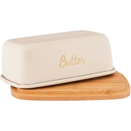 Основа масленки из натурального дерева. Стальная крышка достаточно плотно прилегает к основе, что позволяет защитить продукты от обветривания и проникновения посторонних запахов.